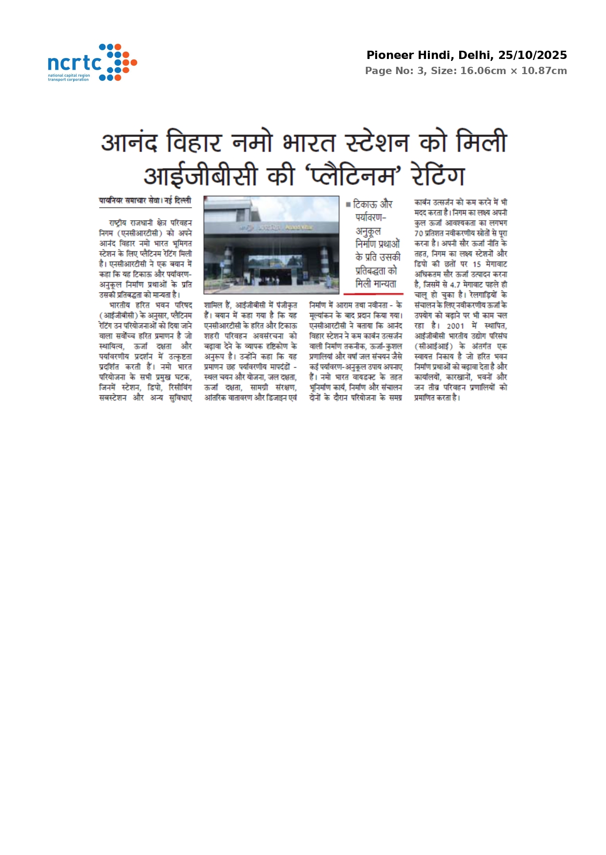 आनंद विहार नमो भारत स्टेशन को मिली आईजीबीसी की ‘प्लैटिनम’ रेटिंग : Pioneer Hindi