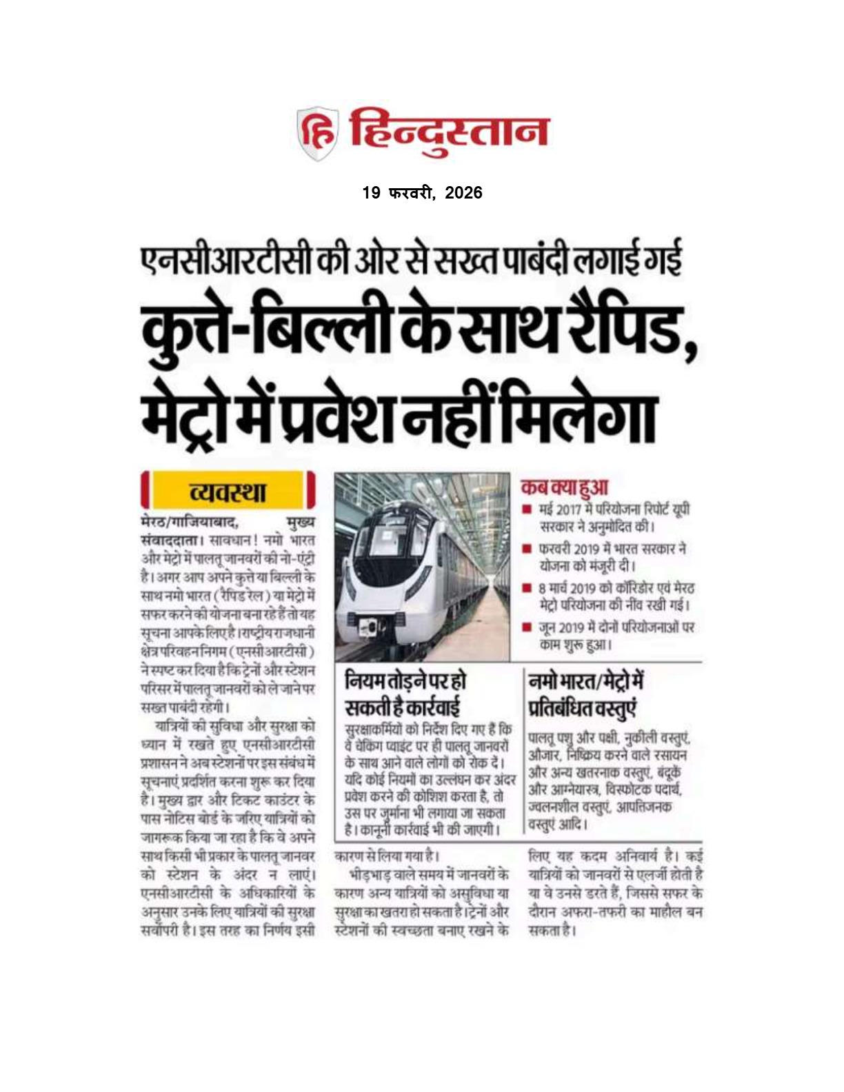 कुत्ते बिल्ली के साथ रैपिड, मेट्रो में प्रवेश नहीं मिलेगा : हिंदुस्तान