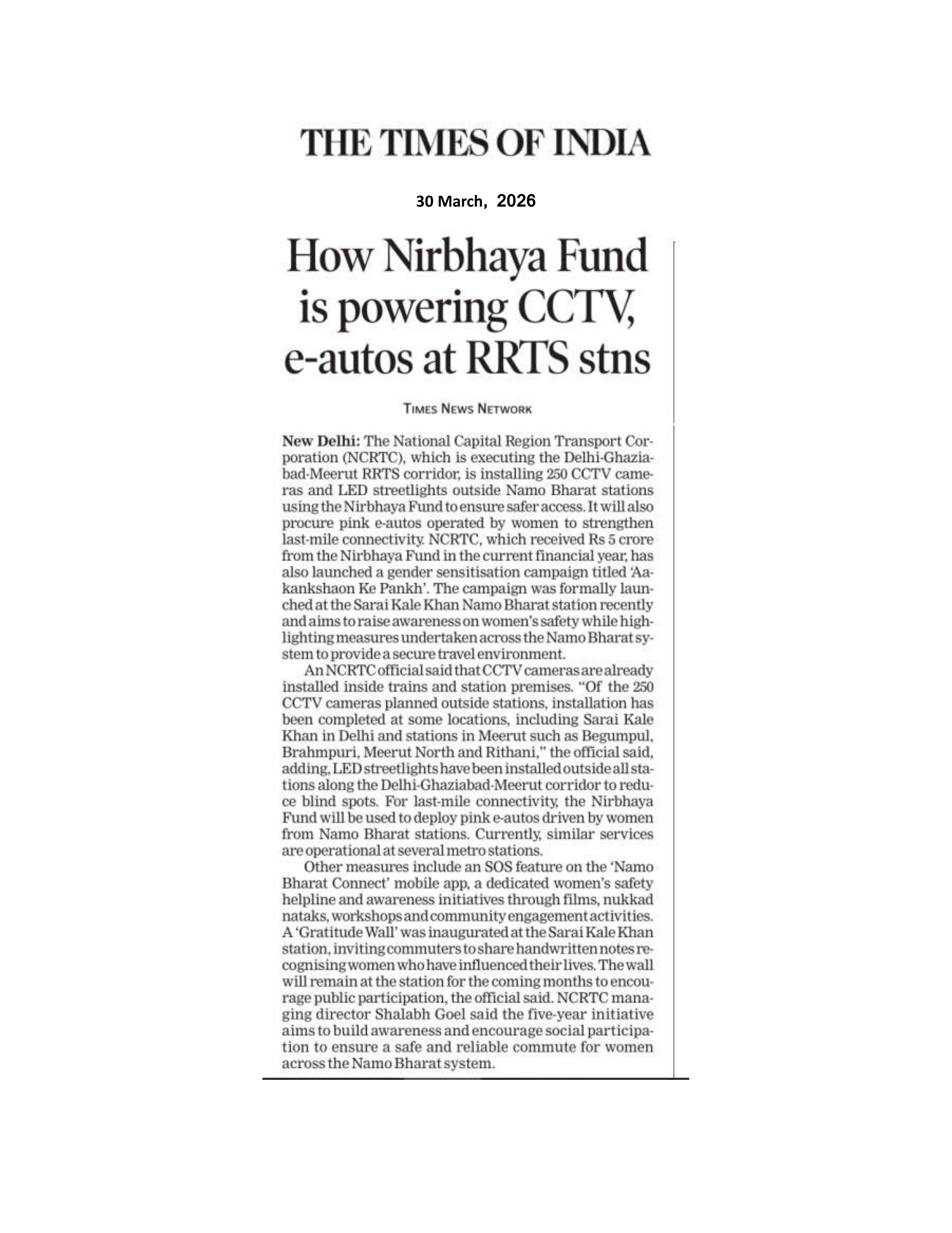 How Nirbhaya Fund is powering CCTV, e-autos at RRTS stns : THE TIMES OF INDIA