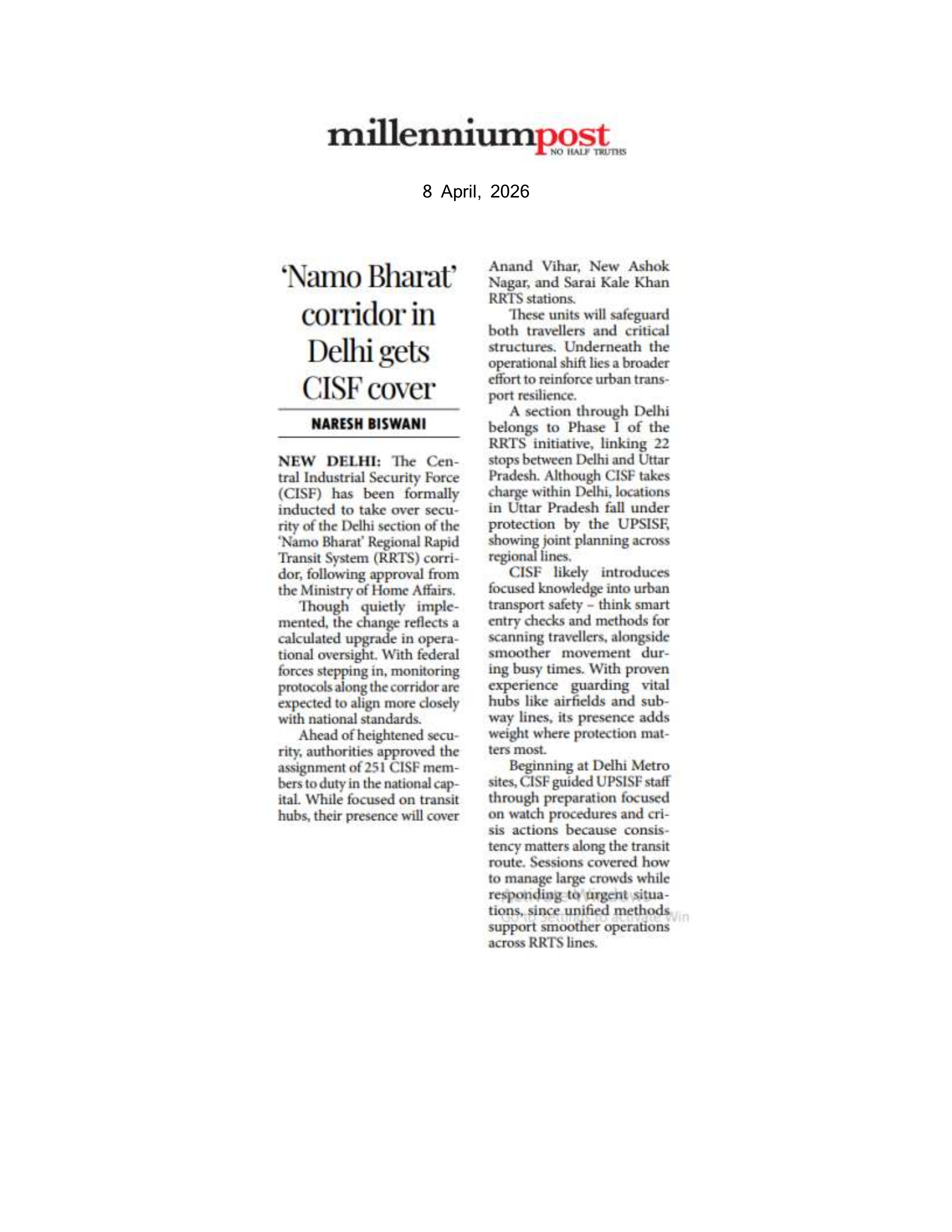 ‘Namo Bharat’ corridor in Delhi gets CISF cover : Millennium post