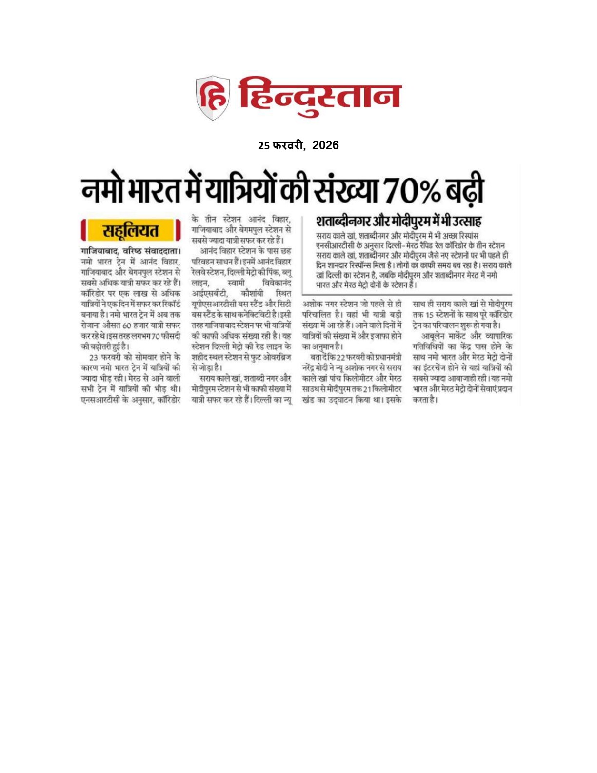 नमो भारत में यात्रियों की संख्या 70% बढ़ी : हिंदुस्तान