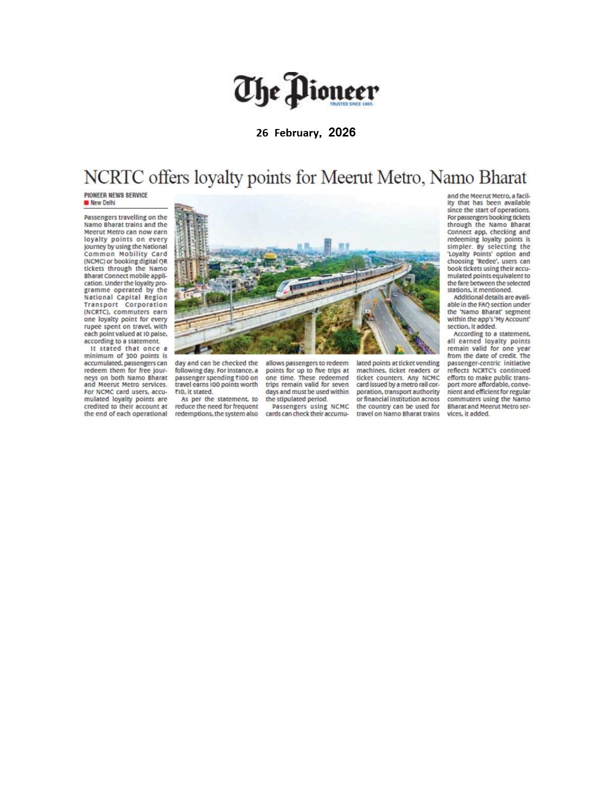 NCRTC offers loyalty points for Meerut Metro, Namo Bharat : The Pioneer