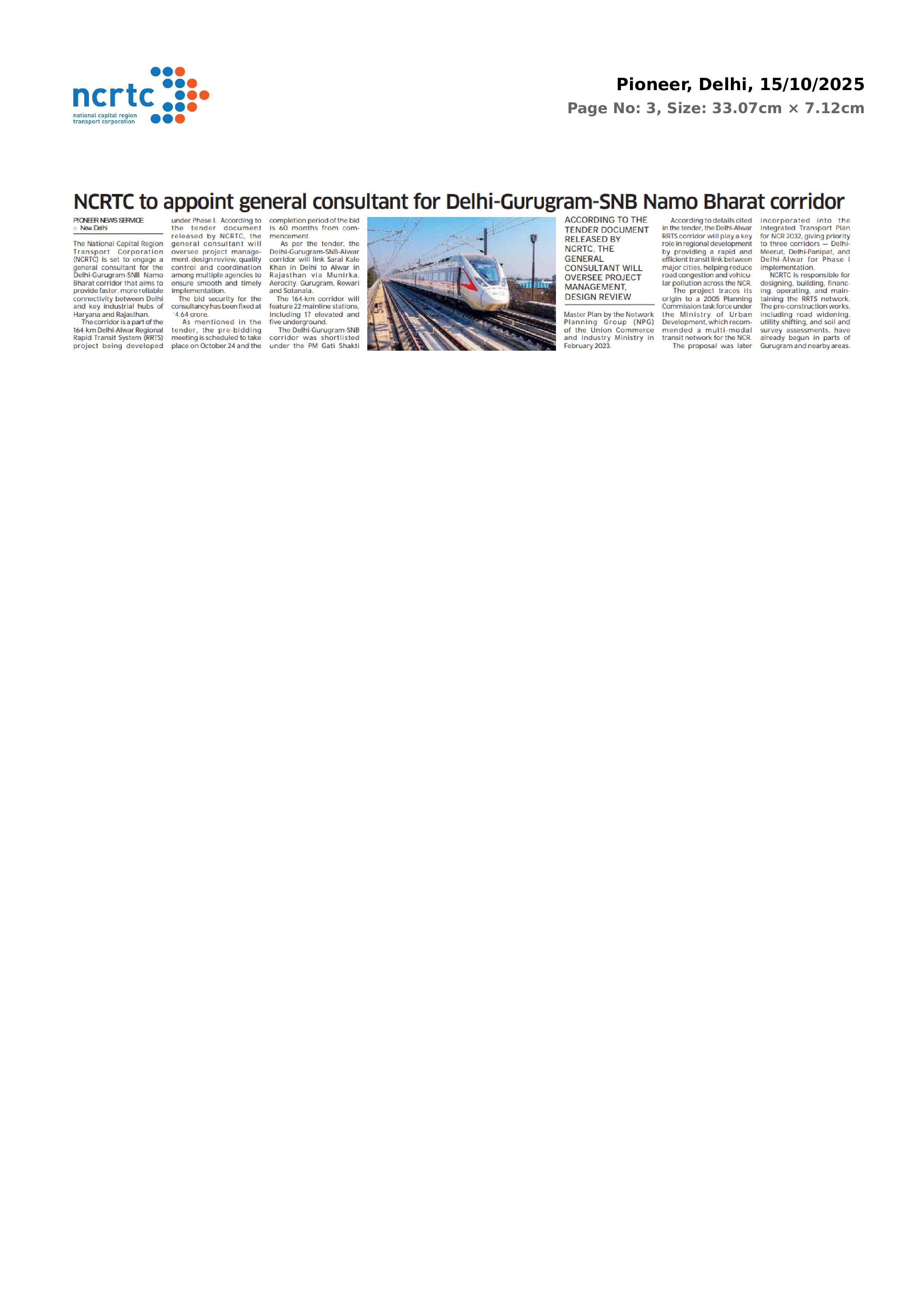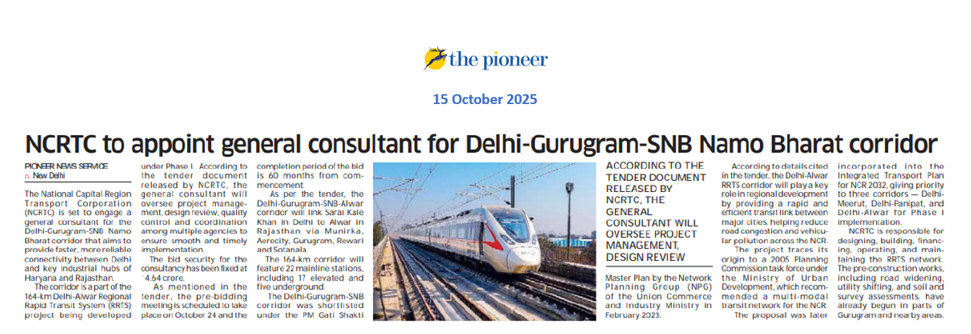 NCRTC to appoint general consultant for Delhi-Gurugram-SNB Namo Bharat corridor : Pioneer