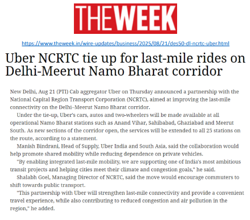 Uber NCRTC tie up for last-mile rides on Delhi-Meerut Namo Bharat corridor : THE WEEK